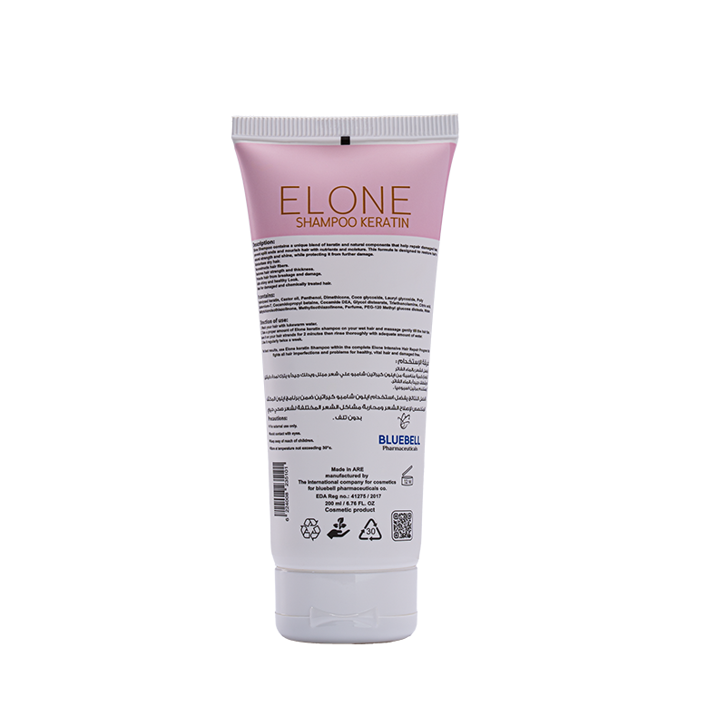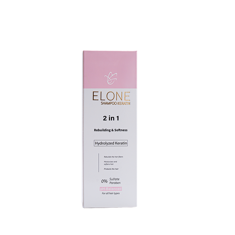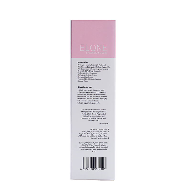 Elone Shampoo is Formulated to Repair Colored or keratin , Treated Hair from The Roots , Enriched with 10% Hydrolyzed Keratin to Restore Lost Moisture and Protect Against Damage , A Blend of Vitamin E and Argan Oil Deeply Nourishes and Strengthens Hair Follicles , Boosting Shine and Softness , Free from Sulfates and Parabens.